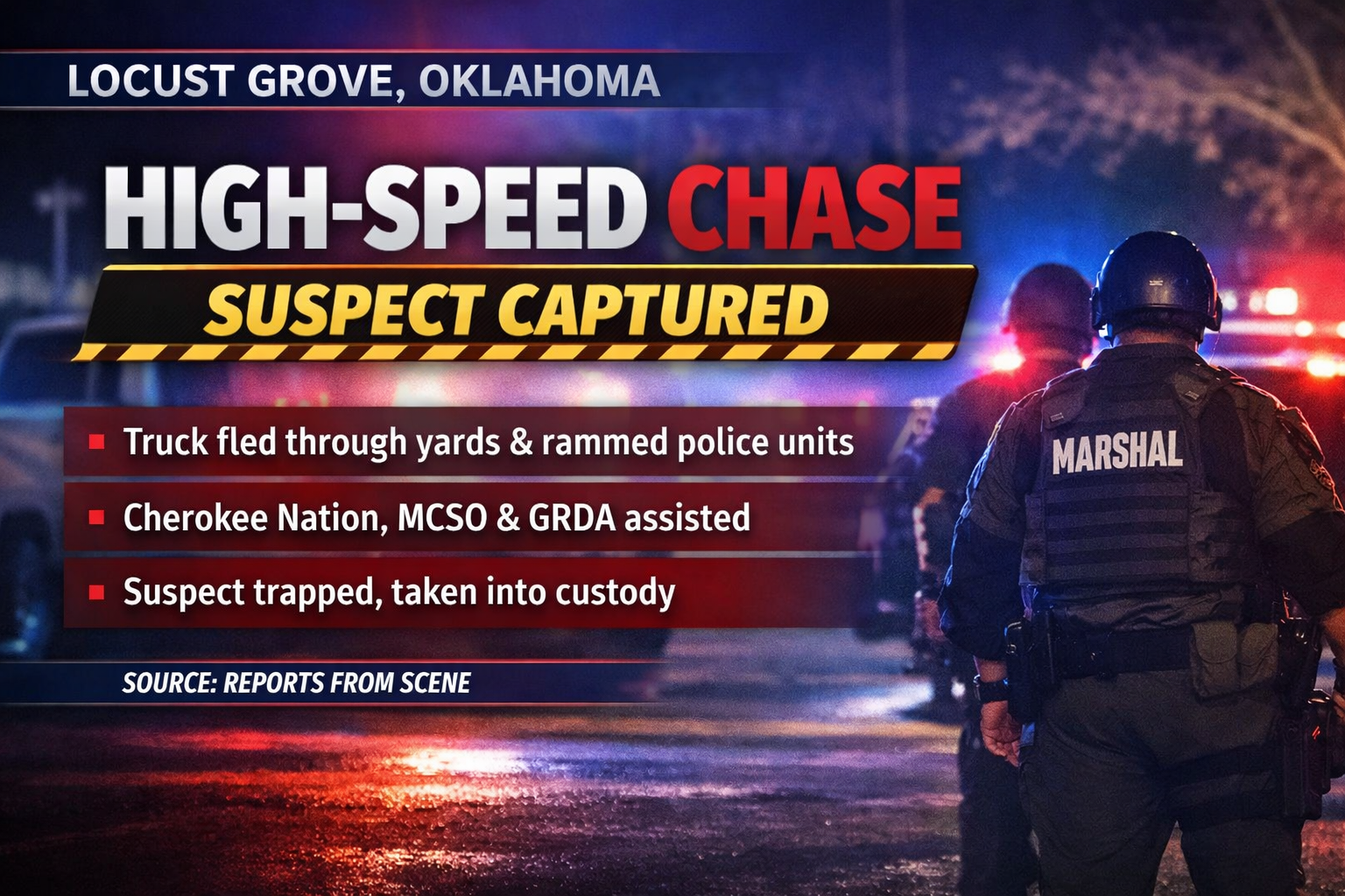 Locust Grove, Okla. — A suspect is in custody following a high-speed pursuit through residential neighborhoods in Locust Grove Tuesday night, according to multiple sources familiar with the incident.