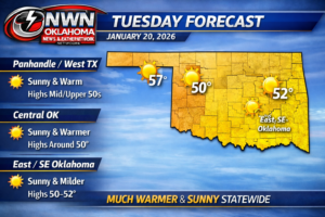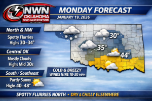 Oklahoma stays on the cold side to start the week, but a quick warm-up arrives Tuesday. Monday features chilly temperatures, a north breeze, and periods of cloud cover. A few flurries or brief light snow showers are possible mainly across north and northwest Oklahoma this morning into early afternoon, but little to no accumulation is expected and travel impacts should remain minimal.