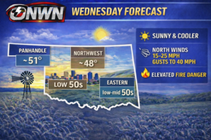 Skies will remain mostly sunny statewide, but strong north winds will be the primary weather concern. Sustained winds of 15 to 25 mph with gusts reaching 40 mph are expected, particularly across central and western Oklahoma.