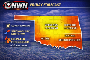 🌬️ Friday is the impact day — expect strong, gusty north winds and very low humidity. Fire danger will be elevated to near-critical, especially across western Oklahoma, so please avoid anything that could spark a grassfire.