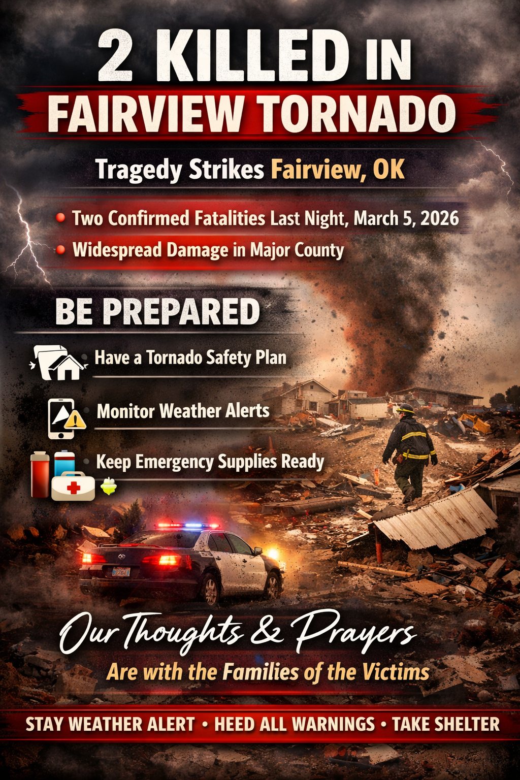 FAIRVIEW, Okla. — Two people have been confirmed dead following a powerful tornado that struck the Fairview area late Thursday night, March 5, 2026. Emergency officials say the large and destructive tornado moved through portions of Major County, leaving behind significant damage and heartbreak for the local community.