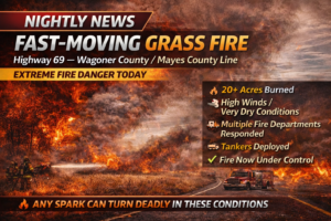 Just after 2pm today, Wednesday, January, 14th, 2026 a 911 call reported the fire spreading rapidly along Highway 69 near the Wagoner – Mayes county line. With high winds and very dry conditions the grass fire is estimated to have burned 20 or more acres before crews were able to gain control.